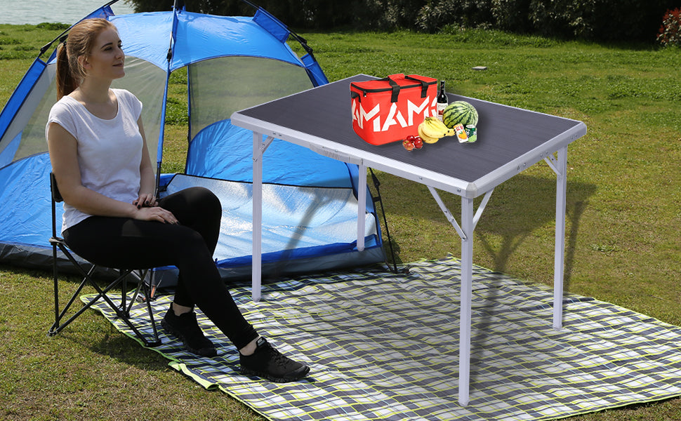 - Are you looking for a durable and foldable table? This gray camping table can meet your needs, it uses MDF for the table top and thickened aluminum alloy as the frame, easy to clean, sturdy and durable, the table can be used for many years. Foldable legs allow the table to be stored in a limited space. Compared to the usual heavy-duty wooden and metal benches, it is very lightweight and designed with convenient handles, so you can easily carry it wherever you want. It can be used indoors and outdoors, as a desk, computer desk, or dining table, or suitable for outdoor activities such as camping, picnics, barbecues, etc. He will be a great choice for you.